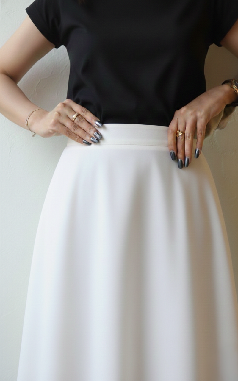 Crafted from premium-quality fabric, the skirt offers a soft, breathable texture with a smooth drape that maintains its shape throughout wear. The fabric is lightweight yet structured, ensuring a graceful fall without clinging.